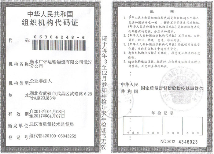 衡水广怀运输物流有限公司武汉分公司组织机构代码证